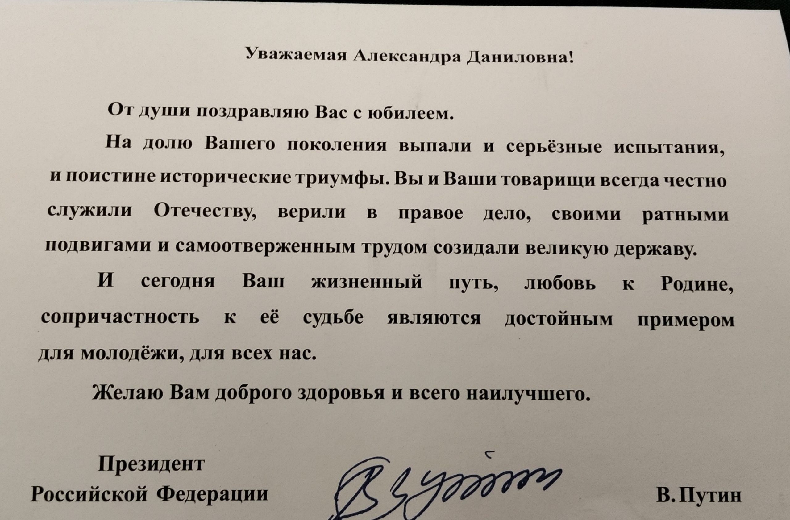 В этот знаменательный день председатель окружного совета депутатов Советского городского округа В.Э.Смильгин, начальник управления социальной защиты населения СГО А.В.Мандровская вручили юбиляру поздравительные письма от Президента Российской Федерации В.В. Путина и Правительства Калининградской области.