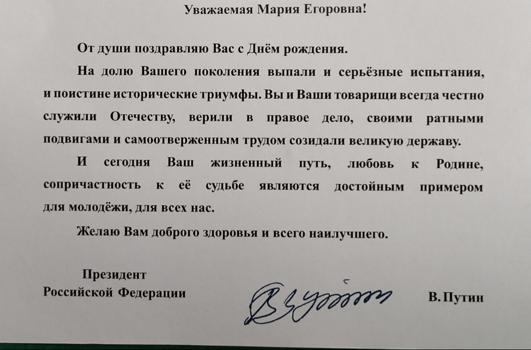 Спасибо Вам, Мария Егоровна, за мирное небо над головой! Желаем Вам крепкого здоровья, бодрости духа. Пусть каждый день дарит радость, улыбки, и рядом всегда будут родные люди!